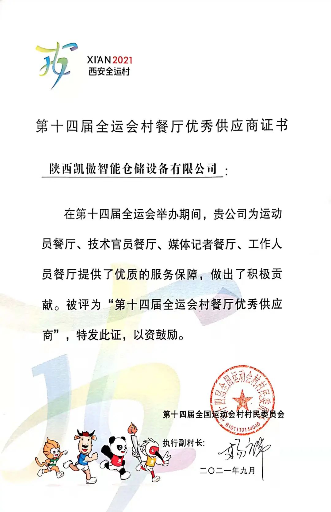 全运会赛事结束后,陕西凯傲智能仓储设备有限公司也收到了来自第十届全国运动会颁发的《第十四届全运会村餐厅优秀供应商证书》,对凯傲在全运会举办期间的服务提出认可与表扬,也为凯傲的发展提供强大动力。