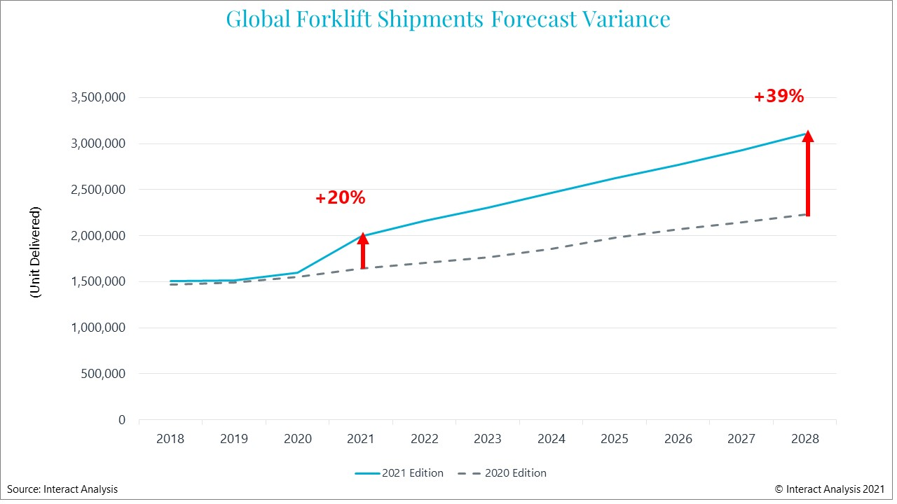 总的来说,我们对叉车市场的预测比之前假设的要积极得多。我们 2021 年的出货量预测比 2020 年的预测高 20%,而我们对 2028 年的预测高出 39%。在某种程度上,2021 年的大幅反弹提升了整个未来十年的增长基数。这在很大程度上是由于制造业和物流业在大流行期间的经验而更加坚定地投资自动化解决方案。