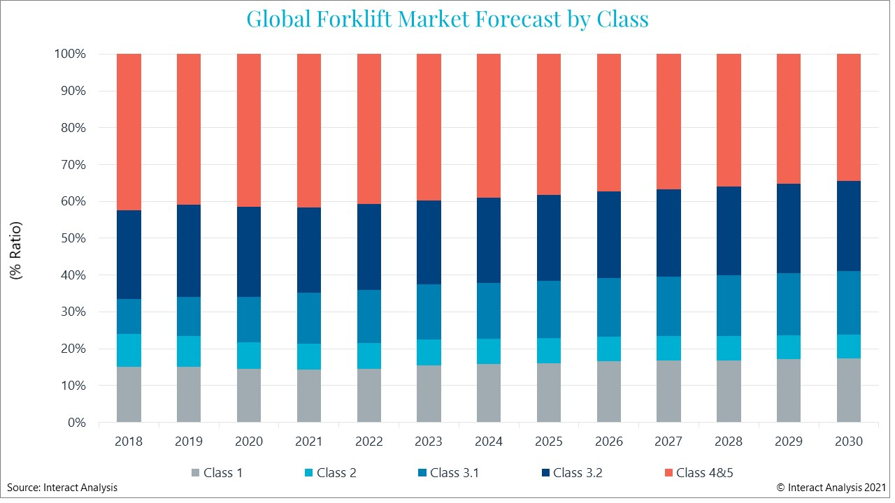 仓储叉车是市场的主要驱动力(下图中的 2、3.1 和 3.2 类)。我们预测它们的市场份额将从 2021 年的 44% 上升到 2030 年的 48%。