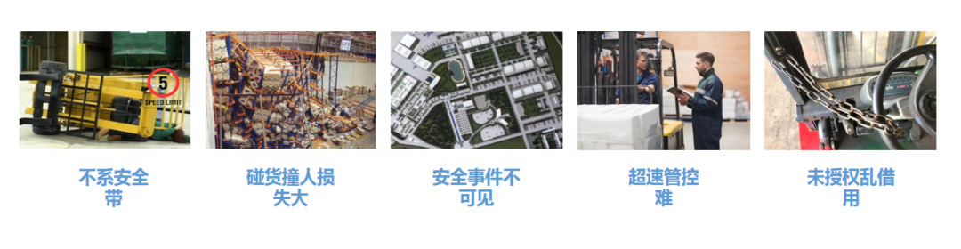 例如:叉车司机不系安全带、超速管控难、未授权乱借用乱停放、碰货撞人事件造成巨大损失,安全事件不可见,且很难理清责任。