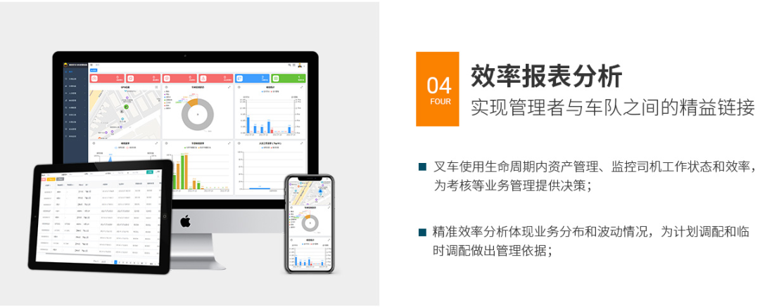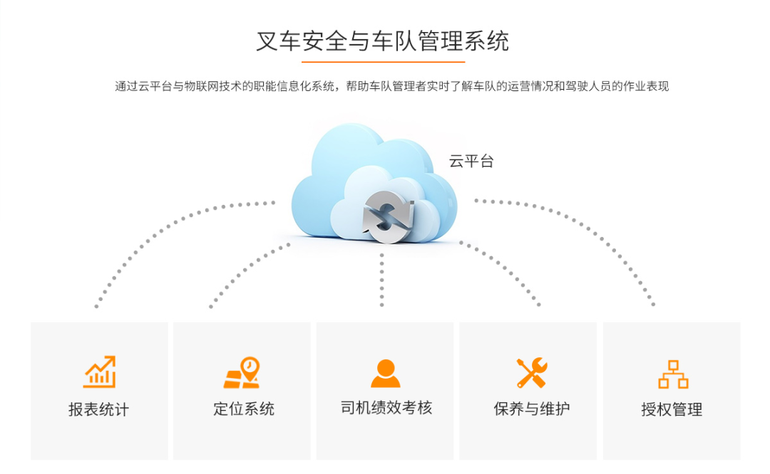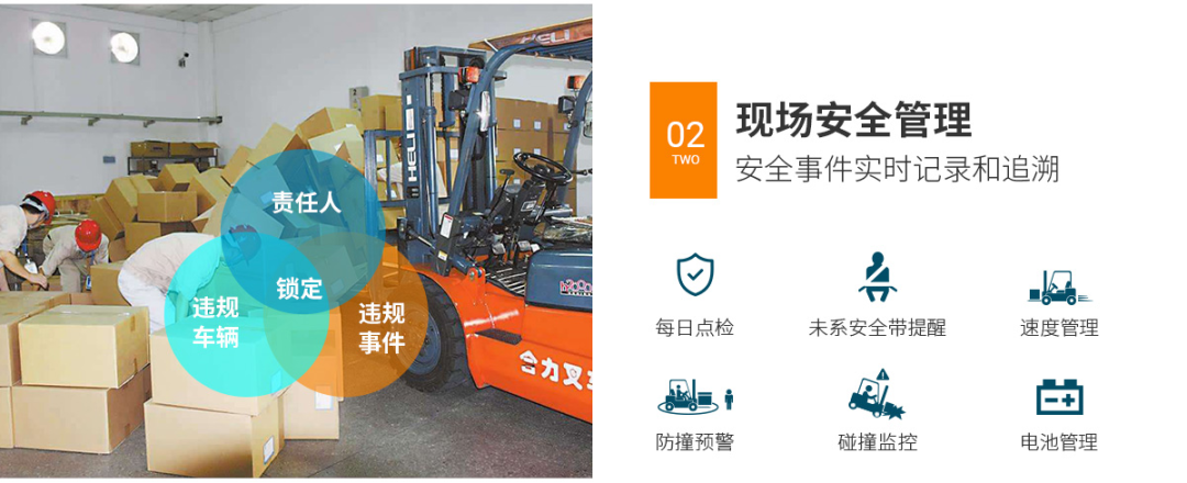 安全管理:辅助司机现场安全驾驶,安全事件实时记录和追溯;推进叉车安全管理标准的形成,有利于规范现场作业,安全制度的落地。