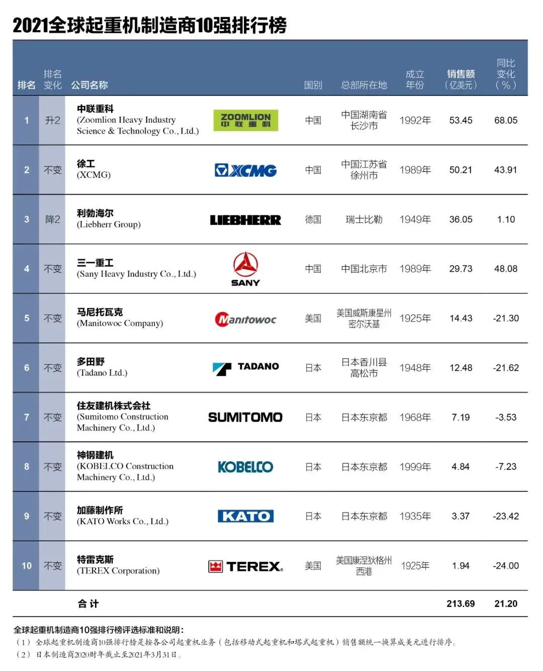 ▲中联重科荣膺2021全球起重机制造商10强排行榜榜首