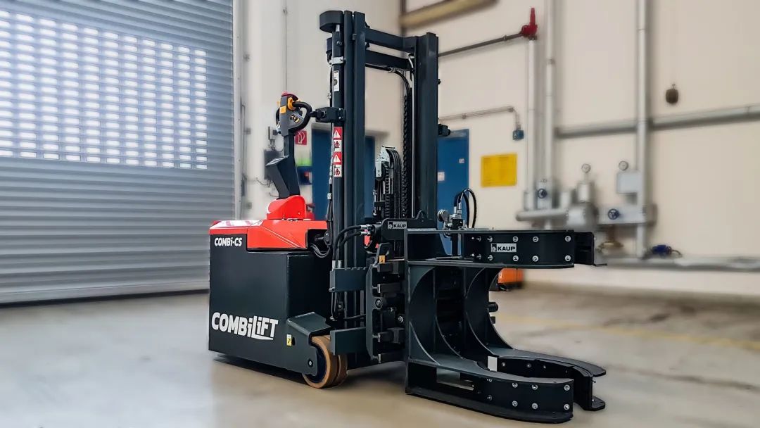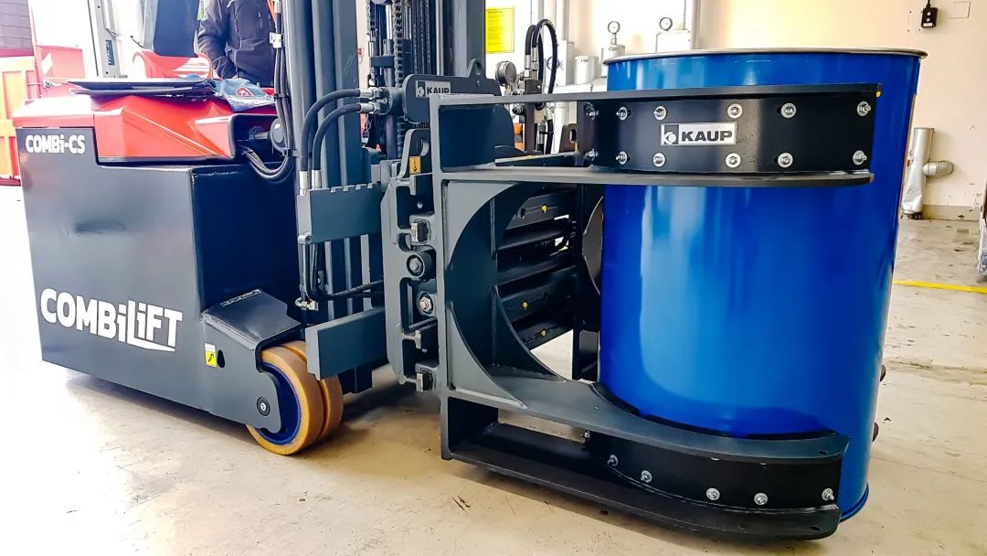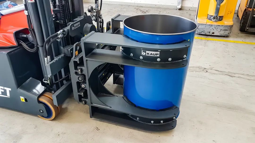 Transporting and emptying cylindrical steel drums is not one of the easiest material handling tasks. But with the Rotating Drum Clamp T455-1 from KAUP, this can be done safely - even in narrow aisles with a Counterbalance Stacker.