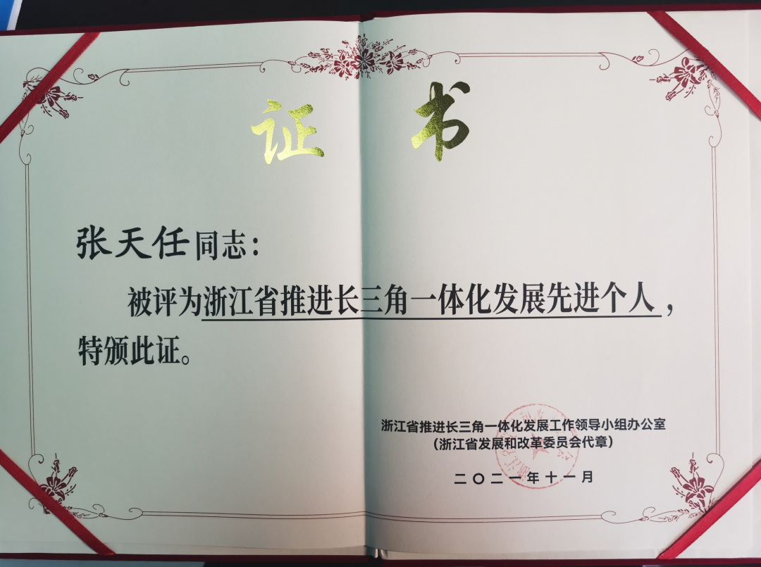 No.6 张天任董事长荣获“浙江省推进长三角一体化发展先进个人”称号