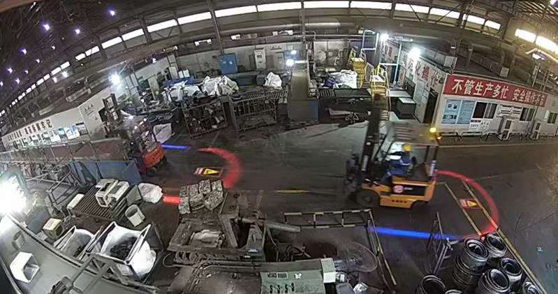 由于视线遮挡,司机未能及时发现行人的存在,可以通过设备来感应行人以及叉车的存在,从而报警。