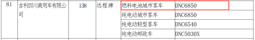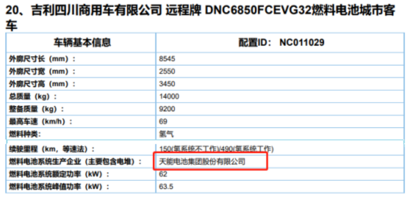 同时,在12月8日,工业和信息化部发布公告,配备天能氢能源自主研发的公交车用燃料电池发动机系统(型号:T62-C-B02)的吉利四川商用车有限公司旗下远程牌燃料电池城市客车(DNC6850)顺利入选《道路机动车辆生产企业及产品》(第350批)。