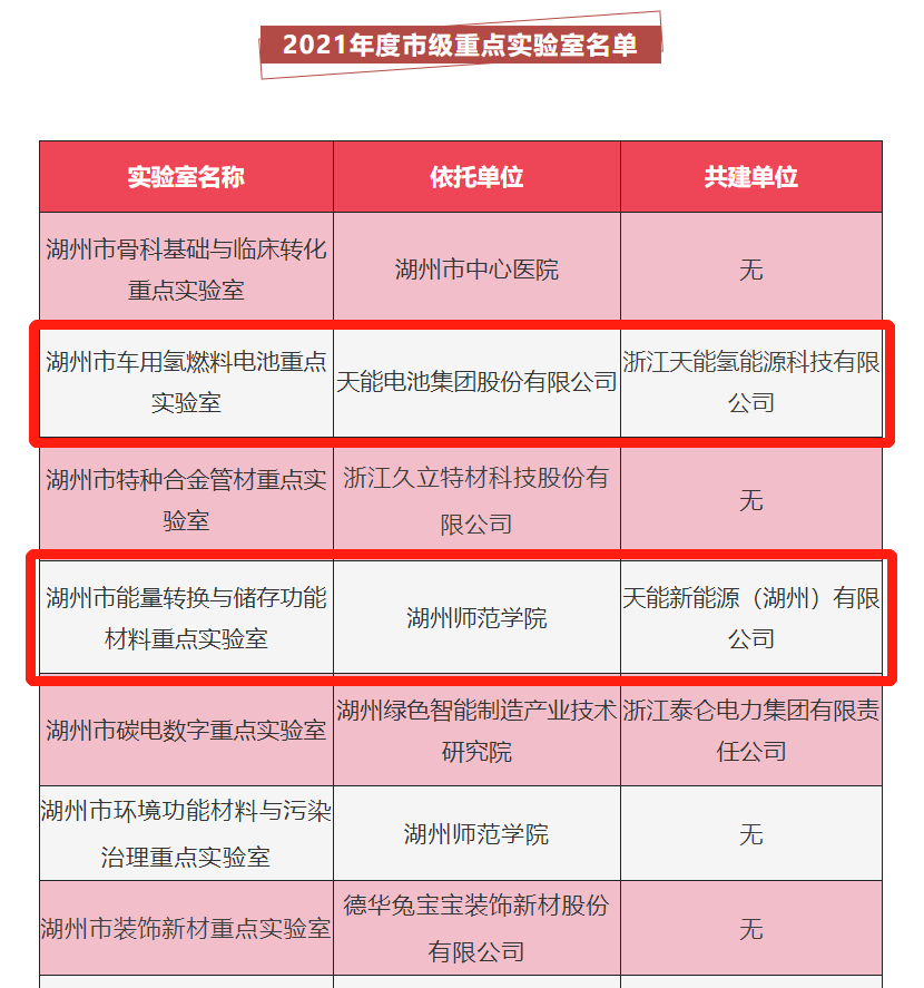 近日,天能集团与旗下天能氢能源科技有限公司共建的湖州市车用氢燃料电池重点实验室顺利入选2021年度湖州市市级重点实验室名单,同时上榜的还有天能新能源(湖州)有限公司参与共建的湖州市能量转换与储存功能材料重点实验室。