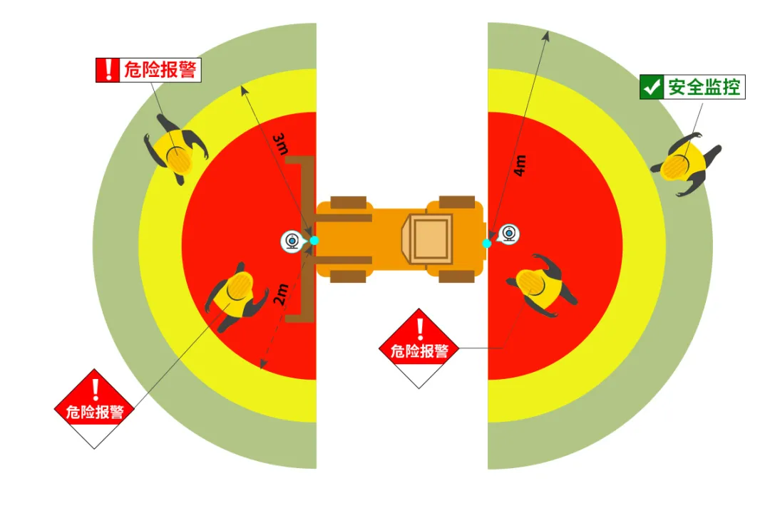 一旦有障碍物或人员进入危险区域,驾驶员通过显示屏即可得到动态防撞报警提示,并且系统辅助车辆完成减速和停车(需选配油门控制器),大大减少事故的发生几率。车顶警示灯触发的语音报警及高亮灯光闪烁也对周边行人起到警示、提醒作用。