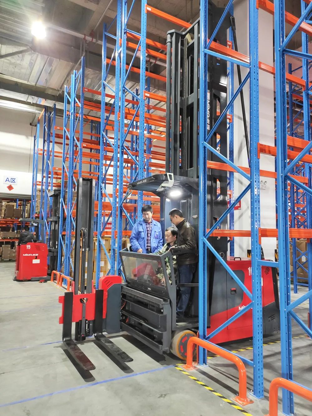 MIMA技术团队和销售服务团队到达客户现场后,克服现场空间紧张等诸多困难,当天完成车辆组装工作,火速进入到现场调试工作。在现场调试过程中,MIMA技术团队和客户充分沟通,为确保客户在双12前仓库投入使用,MIMA技术团队加班加点,通宵奋战,完美的完成了人上型三向叉车窄通道磁导航的调试工作,并反复测试,确保了MIMA人上型三向叉车和货架系统完美匹配,保证了客户高效安全的仓储作业。