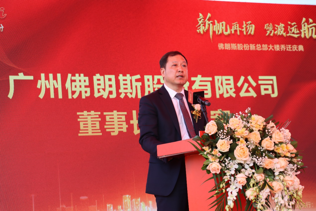 广州市番禺区副区长夏坚先生在致辞中介绍了番禺区的情况并对佛朗斯股份新总部大楼乔迁表示祝贺。番禺区地处粤港澳大湾区地理中心位置,是岭南文化的重要发源地和“海上丝绸之路”起点之一,交通便利,坐拥世界旅客规模最大的高铁客运枢纽广州南站,依托高铁、城际轨道、地铁、高快速路等综合交通路网,番禺成为珠三角“1小时都市生活圈”的中心。番禺区政府打造平台化、生态化的服务平台,对所在区企业提供良好的服务。佛朗斯股份从成立至今坚守社区责任承诺,为番禺区的建设发挥着自己的作用,值此乔迁之际,夏副区长给予佛朗斯充分赞赏并对公司未来发展寄予厚望。希望佛朗斯股份借乔迁之东风奋发图强,凝心聚力打造一个精品极致的企业。