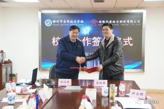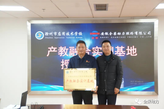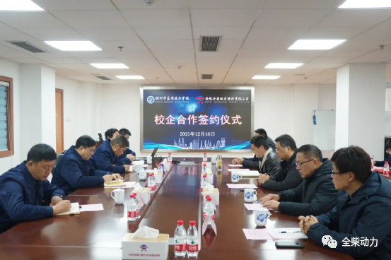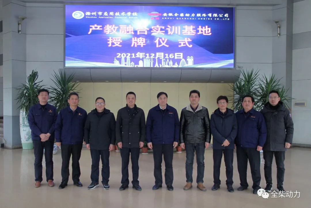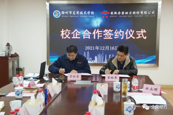 2021年12月16日,安徽全柴动力股份有限公司与滁州市应用技术学校共同举办的“校企人才战略合作签约暨产教融合实训基地授牌仪式”在全柴科技大楼九楼会议室顺利进行。