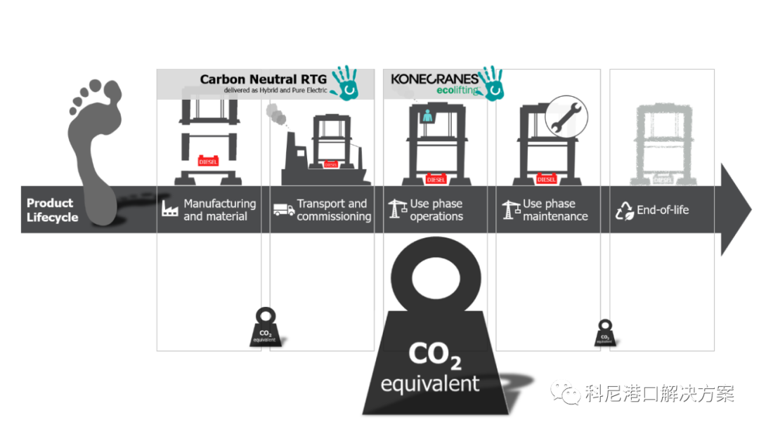 设备的使用是RTG全生命周期中产生碳足迹的主要因素-大约为9/10。对于这一部分,科尼集团已经提供了多种方式以减少碳足迹,例如生态提升(Ecolifting™)驱动方案。设备淘汰后,RTG的钢结构可以完全回收利用,所以该阶段可以减少1/10的碳足迹。