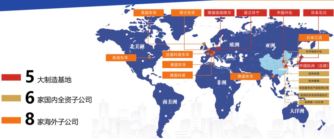 东华链条集团总部位于杭州市临平区国家级经济技术开发区。经过三十多年稳健发展,目前在中国、德国、波兰、日本拥有六个研发制造基地(工厂),在全球拥有东华荷兰、东华英国、东华美国、东华泰国等八家海外销售子公司,拥有杭州自强、杭州盾牌、东华兴化等六家国内全资子公司,是一家集全球研发、制造、营销和市场服务于一体的国际化链传动企业。东华链条集团是中国首批制造业单项冠军示范企业、国家企业技术中心、国家知识产权示范企业、中国机械工业百强企业。