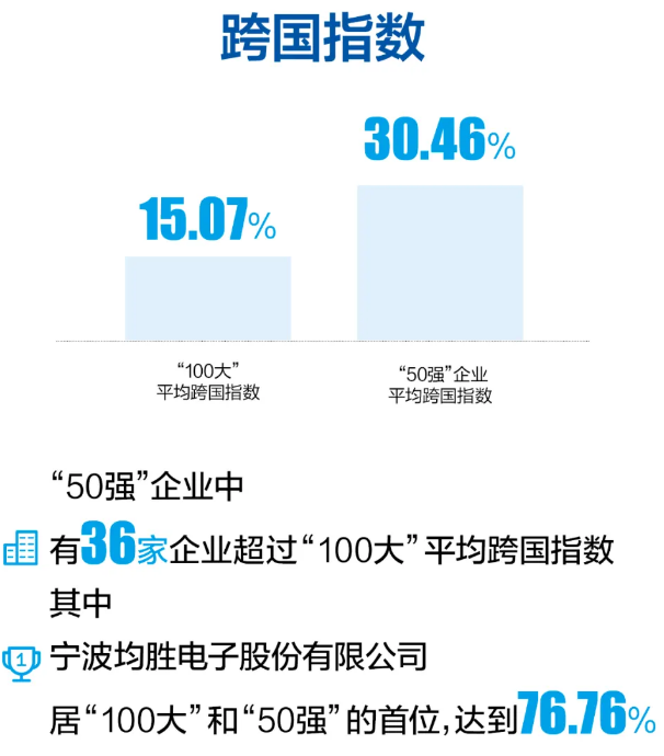 据悉,2021年“50强”综合境外资产、跨国指数、进出口等22项数据组成指标体系,对企业全球资源要素整合能力、跨国经营水平、跨国经营绩效、合规经营等方面按照权重比例进行赋分,通过专家论证,最终按照得分从高到低排名而成。