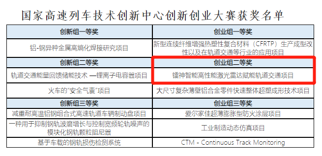 据悉,该大赛共吸引了来自海内外数百家社会科研院所、高校、企事业单位、科创载体的创新项目参与,项目涵盖了国家战略性新兴产业规划中鼓励发展、并与轨道交通产业未来布局发展同频共振的重点领域,经过参赛资格审核、初赛、复赛、决赛等环节的严格评选,最终只有12家企业分别获得创新奖和创业奖。