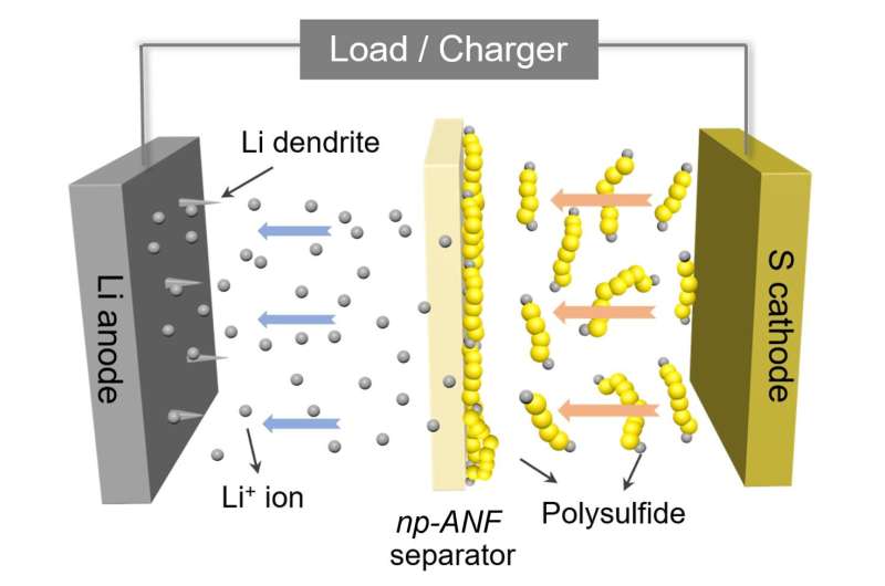 他们通过利用多硫化锂本身来做到这一点。它们粘在芳纶纳米纤维上,其负电荷排斥继续在硫磺电极上形成的多硫化锂离子。然而,带正电的锂离子则可以自由通过。