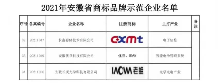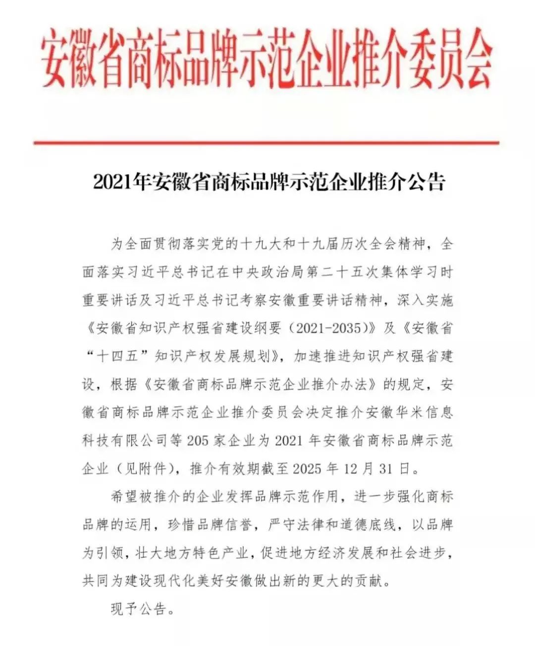 近日,经安徽省商标品牌示范企业推介委员会审查认定,安徽华米信息科技有限公司、长鑫存储技术有限公司、安徽优旦科技有限公司等205家企业获评2021年安徽省商标品牌示范企业称号。