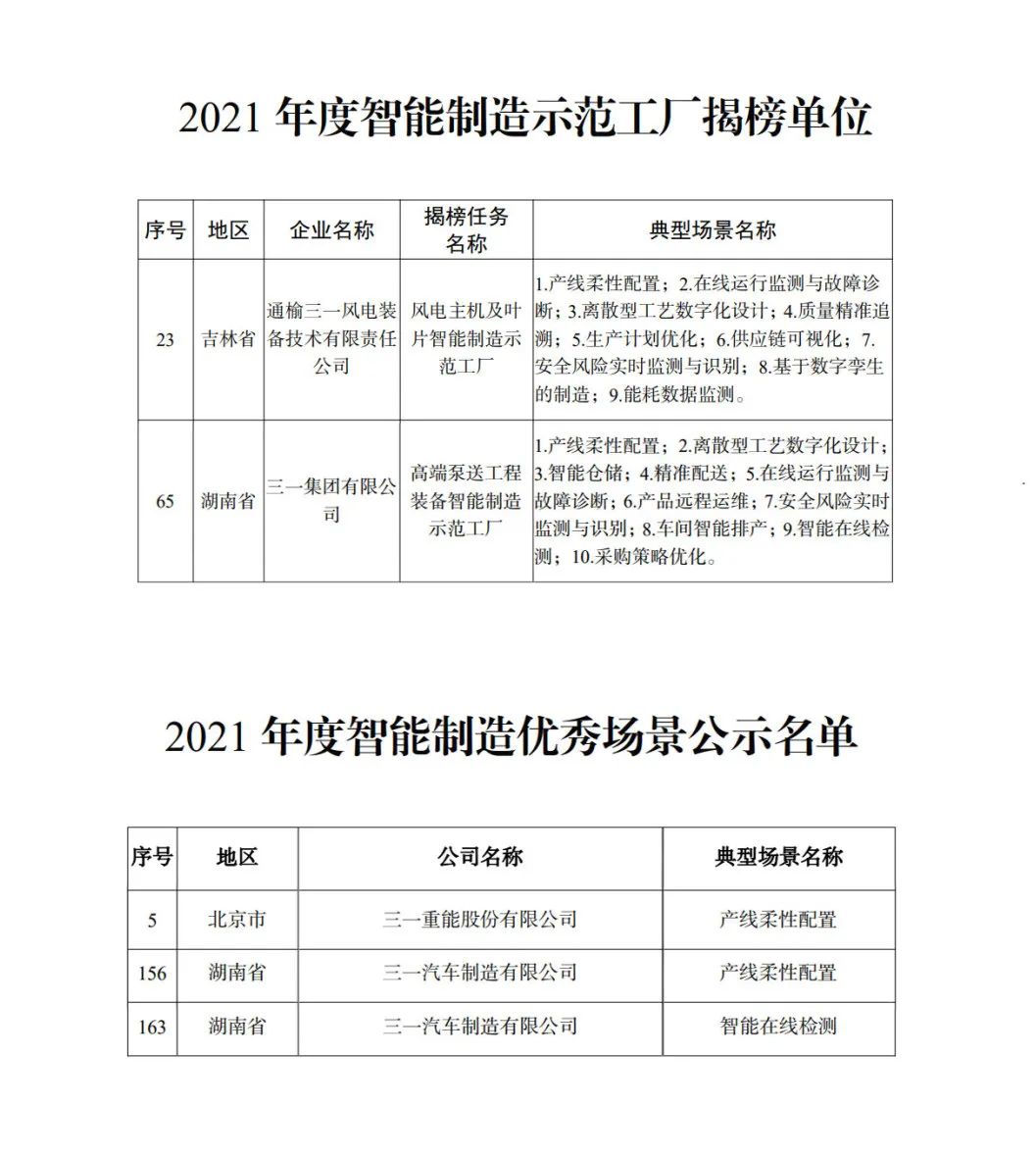 此次,三一成功揭榜“高端泵送工程装备智能制造示范工厂”、“风电主机及叶片智能制造示范工厂”两大任务,一次摘得两大国家级智能制造试点示范工厂荣誉,充分展现了三一数字化转型战略的显著成效和领先优势。