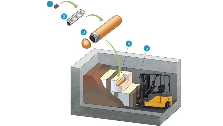 每块重约8000磅(3.6吨)的膨润土砖将由电梯输送到存储层,在那里它们将被拾起并沿着一条狭窄的隧道运输,然后由远程操作的自动叉车分两层堆放。