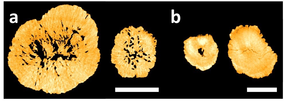 用 X 射线显微镜拍摄的回收阴极颗粒 (A) 和由新材料制成的颗粒 (B) 的横截面。比例尺在 (A) 中为 10 微米,在 (B) 中为 5 微米。