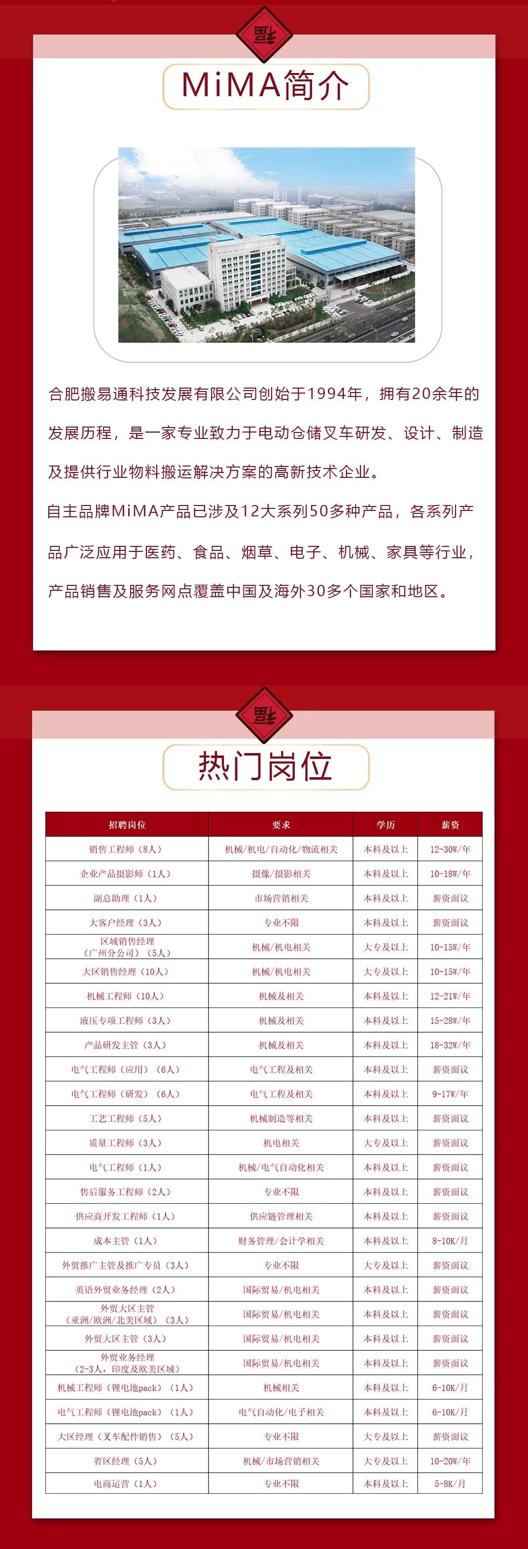 二十多年不断进取, MIMA 品牌以公司强大的科研创新团队为依托,以“安全、耐用、舒适、低碳(环保)”为设计理念,为客户提供500KG —100000KG应用解决方案、仓储设备及 相关服务。 通过不断的技术创新和专利积累,现在我们的产品已涉及12大类50多个品种,如电动托盘车搬运车、托盘堆垛车、前移式叉车、平衡重式叉车、牵引拖车、拣选车、窄巷道叉车、四向叉车、侧面叉车和非常物流设备、AGV、无人巷道堆垛机等等。产品广泛 应用于医药、食品、化工、电子、机械、家具、物流等各个行业。