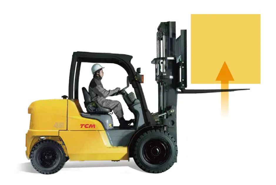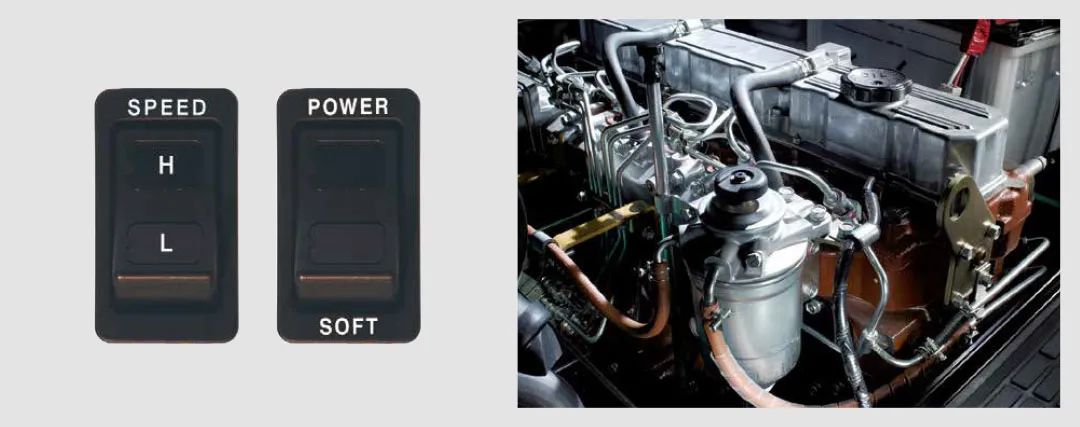 FDM叉车可将行走速度的限制值任意设定为室外(高速)室内(低速)。通过开关操作可进行一键式切换,根据现场情况以最适当的模式进行运转。同时,FDM叉车还可根据作业切换强力(动力优先)/柔和(低油耗、低噪音)模式。