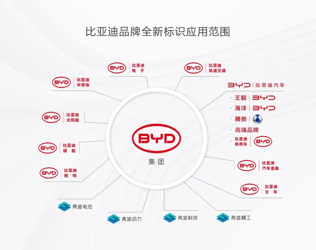 比亚迪集团新标识,将在旗下电子、新能源、轨道交通以及汽车产业中使用,与此同时,汽车产业的乘用车板块各品牌将使用各自的品牌标识。