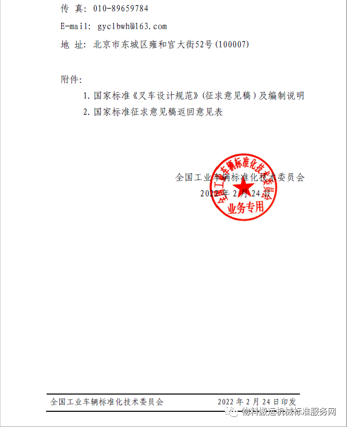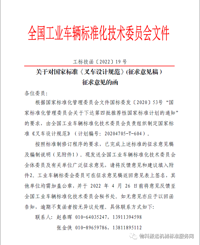 按照标准制修订程序的要求,已完成上述标准的征求意见稿及编制说明(见附件1)。现发送全国工业车辆标准化技术委员会全体委员及有关单位广泛征求意见,请将反馈意见和建议填入附件2。工业车辆标委会委员可在征求意见稿返回意见表上签名,其他单位均需加盖公章,并于 2022年 4 月 26 日前将意见反馈至全国工业车辆标准化技术委员会秘书处。如无意见亦应予以回函告知,逾期不复函者按无异议处理。具体联系方式如下:
