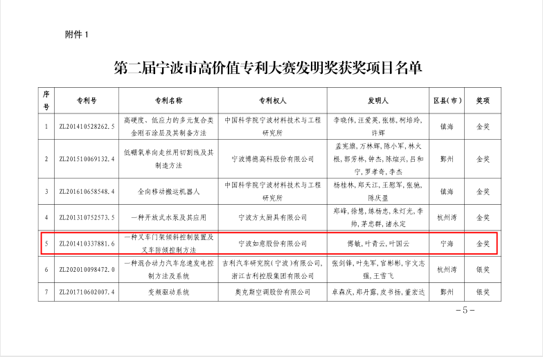 日前,宁波市市场监管局举办了以“鼓励高价值培育,促进高质量创新”为主题的第二届宁波市高价值专利大赛,此次大赛共涵盖机械、电子、化工等领域的224件专利参赛作品,其中发明类192项、设计类32项。经项目申报、专家评审、社会公示等程序,最终产生发明金奖5项、银奖10项、外观设计奖20项。