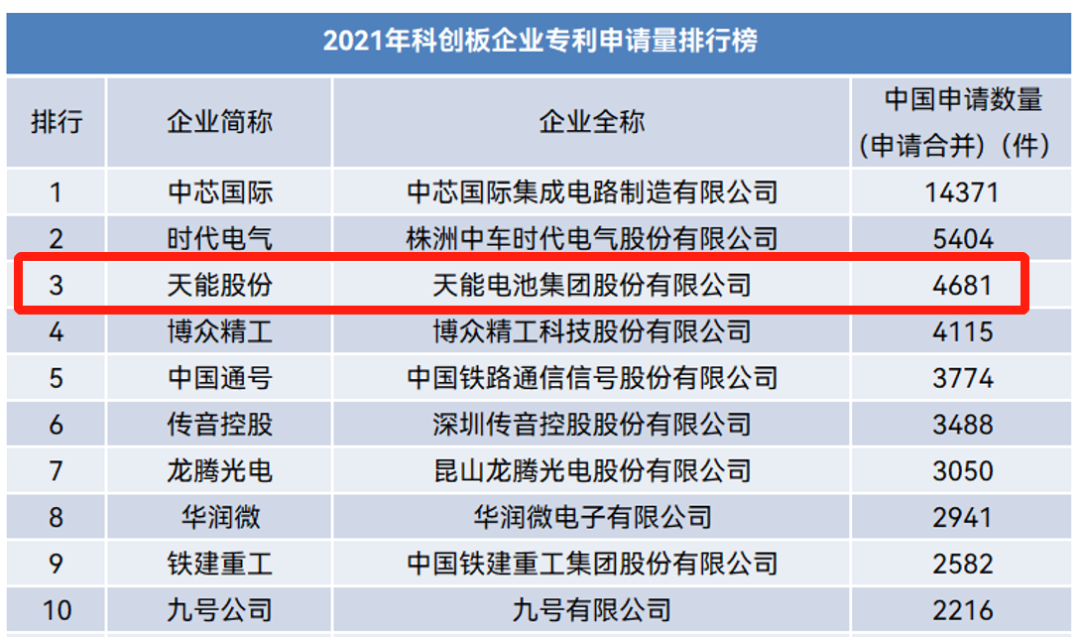 IPtoday与大为知识产权今日联合发布“科创板上市企业专利申请排行榜”,截至2021年底,科创板上市企业专利申请总量达146018件,其中,天能股份以4681件的专利申请量位居总榜单第三位,位居节能环保行业的第一位。知识产权作为科创属性评价的“硬”指标,反映出企业核心技术成果商业化过程中的行业竞争力,专利成果产出数量体现了科创企业“硬”科技底色。