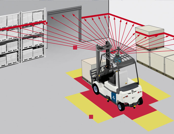 作为自动化和控制领域的专家,BHS 使用激光和摄像头导航重新定义了空间定位和停车位检测的精度。用户可以独立规划路线,重新定义停车位。叉车使用激光扫描仪将自身定位到给定的空间结构。导航算法可靠地过滤掉由停放的材料或车辆引起的房间变化。三个额外的安全激光系统用于避免碰撞和保护人员。