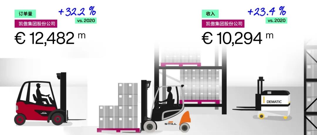 凯傲集团上一财年的成功业绩就是最好证明:凯傲集团订单额再创新高,达到124.82亿欧元,与上年(94.43亿欧元)相比,增加近三分之一(32.2%)。尤其是工业车辆和服务细分(ITS)同比增长40.9%,超越了疫情之前2019年的水平。供应链解决方案细分(SCS)的订单额也有提高,增长了18.5%,达到43.29亿欧元(上年:36.55亿欧元)。2021财年期末的订单簿总额达到66.59亿欧元,较上年底显著增加(上年:44.41亿欧元),工业车辆和服务细分的客户在年底前提前下单也是促成这一增长的原因之一。集团综合收入在2021财年增长了23.4%,达到102.94亿欧元(上年:83.42亿欧元),首次突破100亿欧元大关。