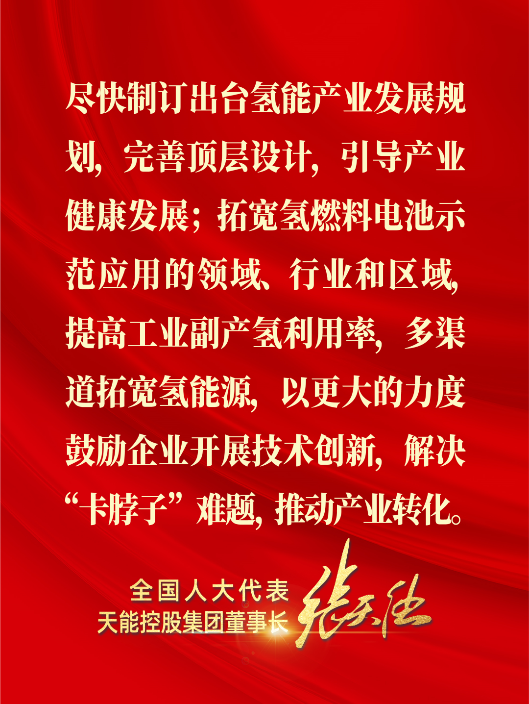 氢能是涉及能源及交通两个十万亿级别市场的战略性新兴大产业。目前,主要面临电池汽车产业化步伐慢、关键核心技术“卡脖子”、应用场景单一、工业副产氢利用率不高、低水平重复建设等问题。综上所述,只有全面扩大氢能及燃料电池的应用范围,丰富应用场景,完善基础设施,形成规模优势,才能有效降低制氢用氢成本,提高技术水平,“以用促进”建强产业链,推动全产业链的成熟。据此,张天任代表建议: