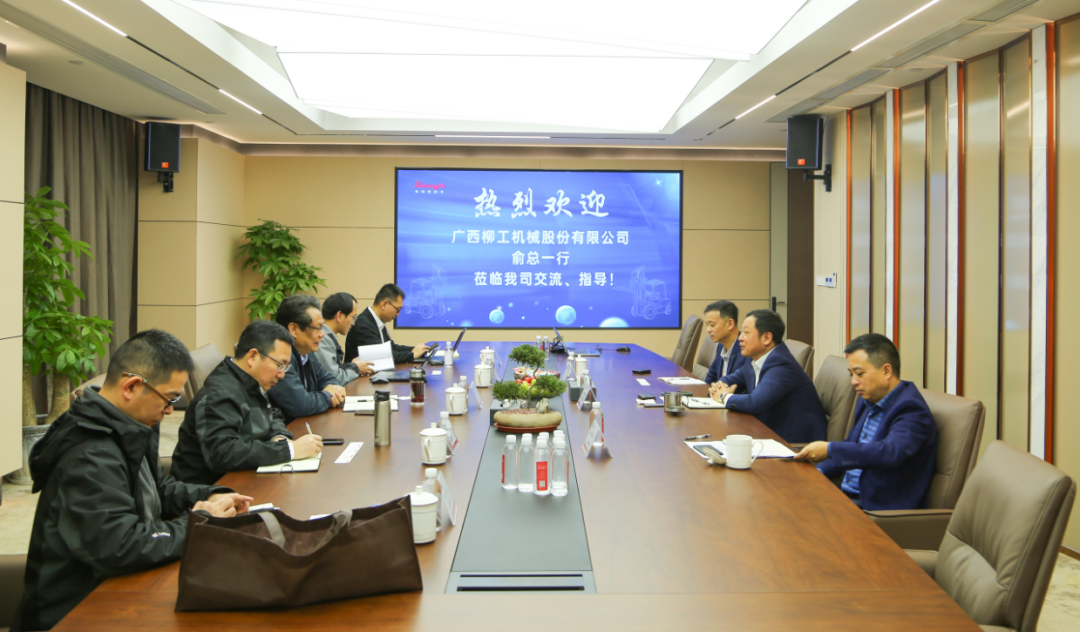 (参观企业文化馆、车联网监控中心、智能仓库)座谈会上,董事长对俞总一行的来访表示热烈欢迎,随后董事长详细介绍了公司的情况,希望通过此次深化交流,进一步加强多层面合作,推动双方长足发展。俞总介绍了柳工集团近年来的发展、战略情况,并希望双方进一步加强沟通交流,实现双赢和共同发展。