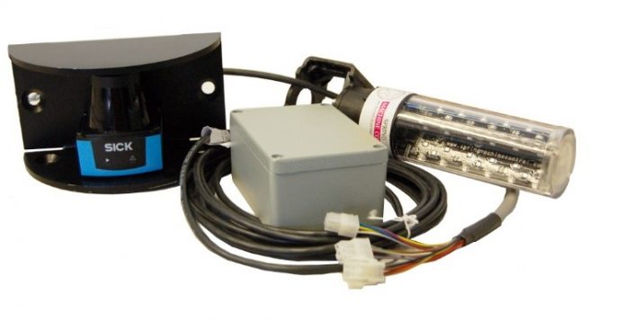 可设置的不同拦截区域。两者均由单独的数字输出管理,扫描宽度可在0 到120°之间调节,障碍物检测距离为20 / 800cm。该传感器执行二维“2D”扫描,并以5 厘米的精度检测静止或移动的人和障碍物,几乎立即对出口上的障碍物做出反应。