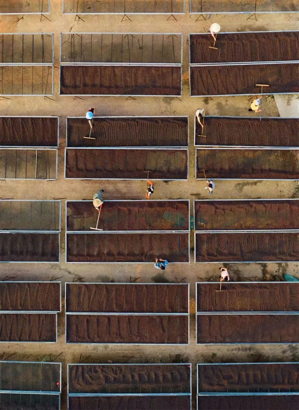 这是云南普洱市思茅区一家企业的咖啡晒场,工作人员在翻晒咖啡资料图片-新华社发