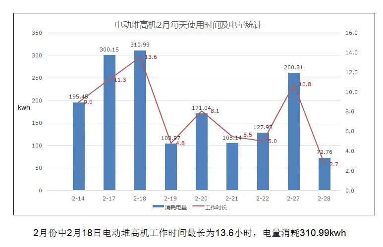 此次交付的三一SDCE90K7电动堆高机采用329kwh大容量磷酸铁锂储能电池组,某港口的作业数据显示,设备作业最高可达13.6小时(电量消耗311Kwh),且支持大功率双枪充电,充满电仅需1小时。