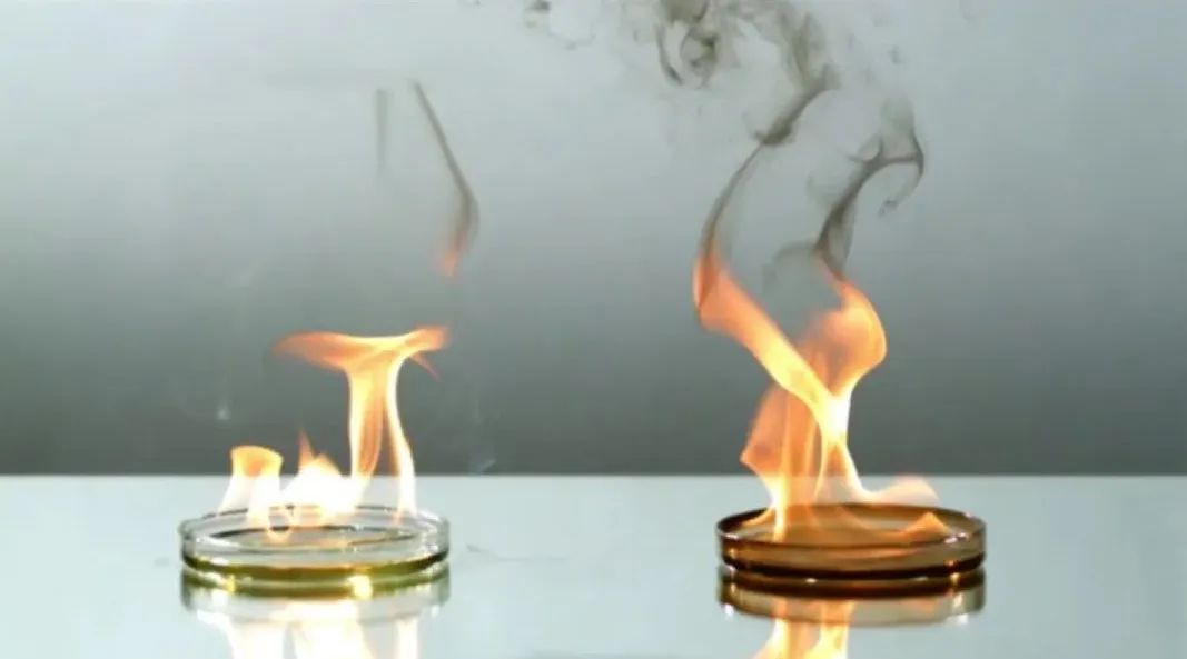 生物柴油与化石柴油燃烧对比图,左侧为生物柴油