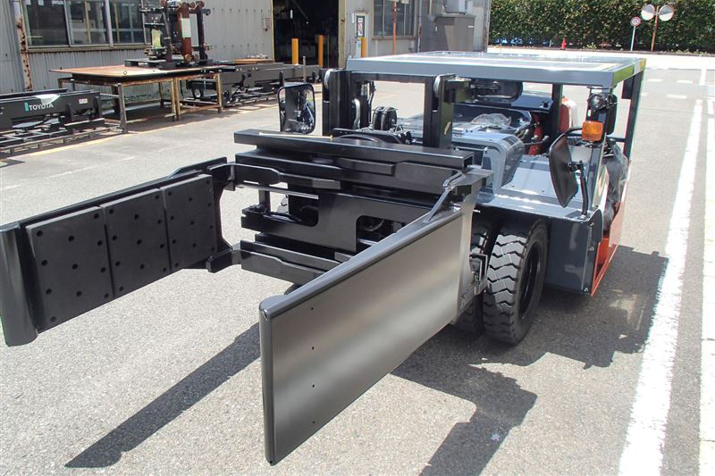 丰田工业开发的专用叉车,由于在船仓作业,因此叉车门架的高度降低了,货叉的形状也发生了变化。