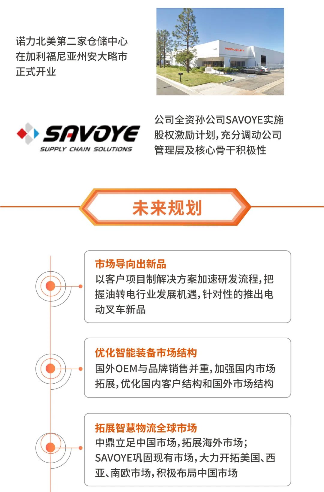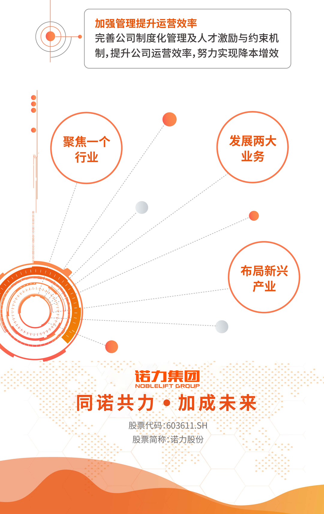 未来,公司将继续以“聚焦一个行业、发展两大业务、布局新兴产业”作为公司产业发展目标。“聚焦一个行业”指聚焦智能物流行业,“发展两大业务”指积极发展智能物流装备业务和智慧物流系统业务,“布局新兴产业”指围绕智能制造、工业物联网、5G、人工智能等新兴产业进行兼并重组,实施资本运作。诺力股份将以此为新起点,踏上新征程,同诺共力,加成未来!
