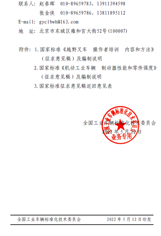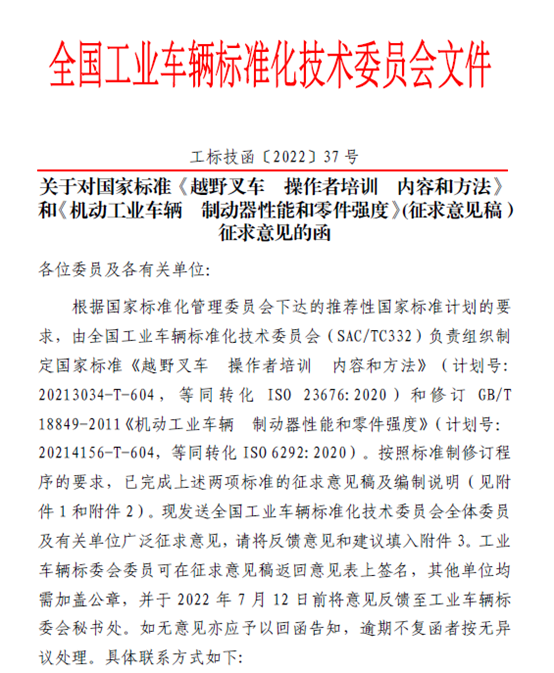 根据国家标准化管理委员会下达的推荐性国家标准计划的要求,由全国工业车辆标准化技术委员会(SAC/TC332)负责组织制定国家标准《越野叉车 操作者培训 内容和方法》(计划号: 20213034-T-604,等同转化ISO 23676:2020)和修订GB/T 18849-2011《机动工业车辆 制动器性能和零件强度》(计划号:20214156-T-604,等同转化ISO 6292:2020)。按照标准制修订程序的要求,已完成上述两项标准的征求意见稿及编制说明(见附件1和附件2)。现发送全国工业车辆标准化技术委员会全体委员及有关单位广泛征求意见,请将反馈意见和建议填入附件3。工业车辆标委会委员可在征求意见稿返回意见表上签名,其他单位均需加盖公章,并于2022年7月12日前将意见反馈至工业车辆标委会秘书处。如无意见亦应予以回函告知,逾期不复函者按无异议处理。具体联系方式如下:
