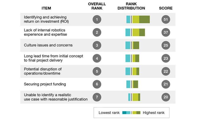 当被问及他们在决定采用机器人技术时考虑的最重要的商业因素时,70% 的人表示实现投资回报非常重要或极其重要,而 64% 的人认为投资回报时间非常重要或极其重要。其次是总拥有成本 (60%)、价值实现时间 (56%)、投资风险 (50%) 和转换解决方案的成本 (36%)。