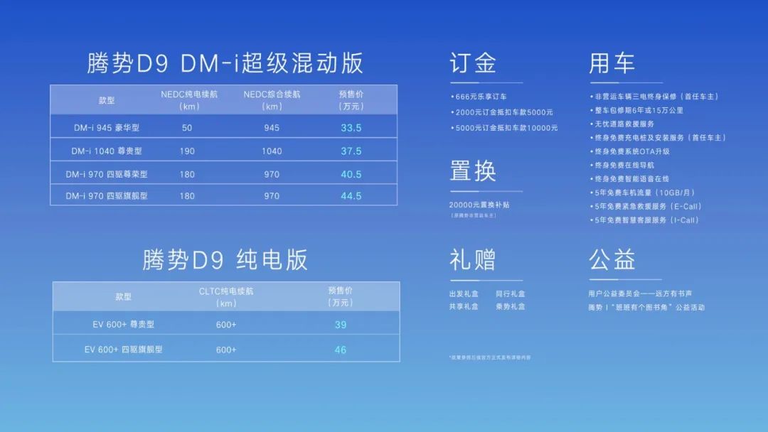 在此次发布会上,腾势品牌全新战略下的首款车型——腾势D9正式开启预售,共带来DM-i超级混动和纯电共6个配置版本,预售价格区间为33.5万元-46万元;另外,还推出一款创始版车型,预售价为66万元,限量发售99台。
