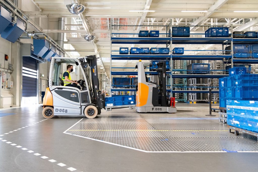 带有可伸缩门架的FM-X 叉车也已用于大型仓库,由于主动负载稳定(ALS),可实现更快的运输。它们的自动平衡脉冲停止了桅杆的振动,从而将机架上的等待时间减少了80%。在生产小型汽车的车身车间中,使用了带有电动或液压输送机的智能牵引套件,以确保将材料运输到生产线。