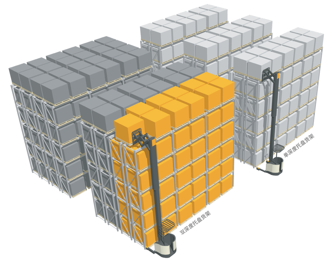 双深度解决方案,能使托盘库位增加 20% - 40%。橙色标出的托盘位表示双深度托盘货架与单深度货架相比,能够获得的额外存储空间,增加的具体存储位视实际空间尺寸而定。
