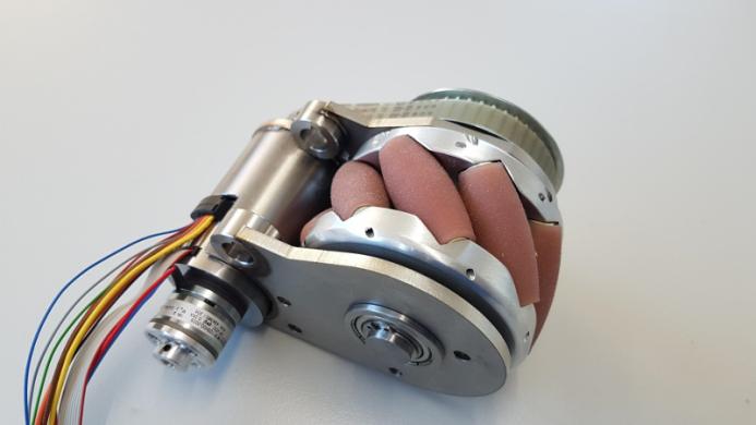 标准车轮仅沿与其轴相同的方向运行。要使用此类轮子精确定位输送机,请以与停车时相同的方式进行操作。为了避免这种情况,Evocortex 的设计师决定使用 Mecanum 车轮。车轮没有封闭的运行表面 - 相反,桶形滚轮围绕其周边放置。它们与车轮的轴线成 45 度角连接,并且可以围绕自身轴承的倾斜轴线旋转。选择滚子的形状、尺寸和间距,以提供具有连续滚动表面的轮子。