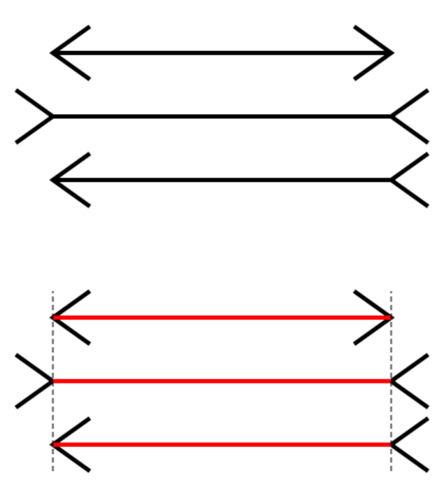 上面这张图向大家展示了经典的米勒-莱尔错觉。这个视觉现象表明将一个V型记号放到线段两端可能造成其显得比实际更短或更长,(长短) 取决于V型记号的朝向。这个经典的错觉证明了人类视觉感知错误,我们有可能会对距离、空间产生误判!