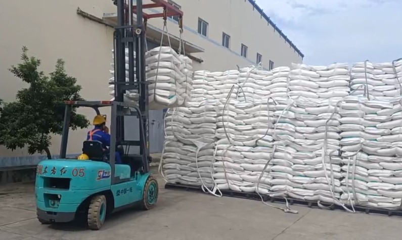 位于广东省湛江市的广东金岭糖业集团公司,2台配装3级6米门架、80V240Ah钛酸锂电池的东方红CPD3.0t钛酸锂-享锂款电动叉车来往穿梭,稳健的用吨布吊满载白色的砂糖包从原糖加工车间徐徐运出。