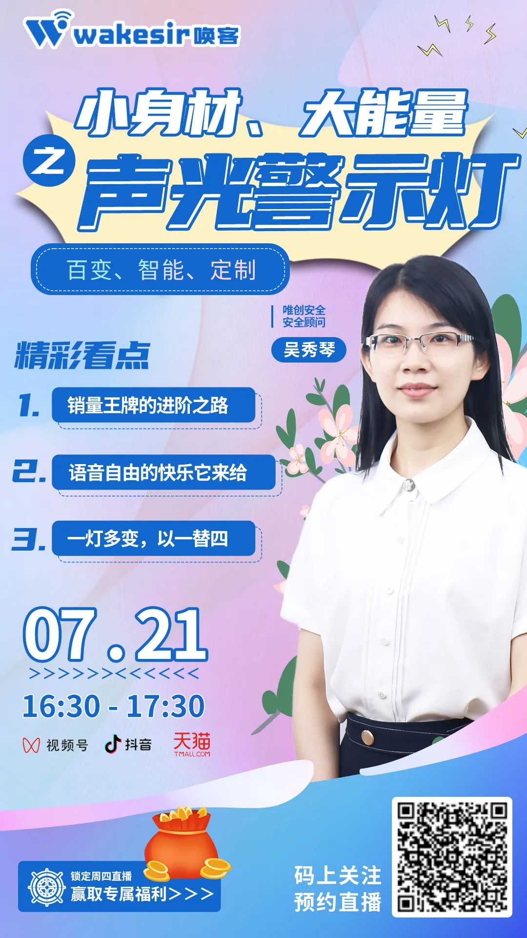 唤客的警示灯还经常被用于一些大型设备的运行提醒、自动化设备故障提醒,一个小小的警示灯、信号灯,就是一道安全防线,就像一线员工的安全“专员”。小身材、大能量的声光警示灯,百变、智能、可根据场景需求做定制。本周四唯创安全直播间,将由安全顾问吴秀琴为我们带来更多关于警示灯的功能、用法的介绍。