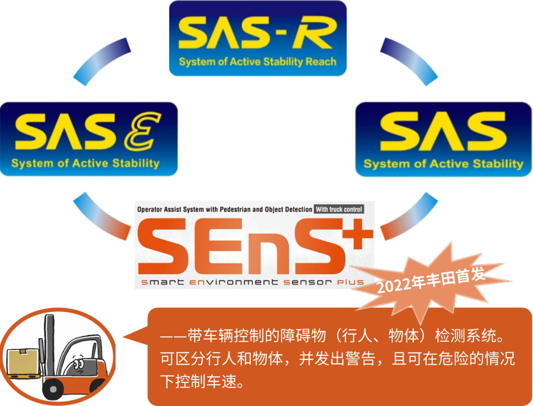 1998年,主动式稳定系统(SAS)问世,随后的24年里,丰田又先后推出了针对前移式叉车(SAS-R)和电车的主动式稳定系统(SAS-ε)。